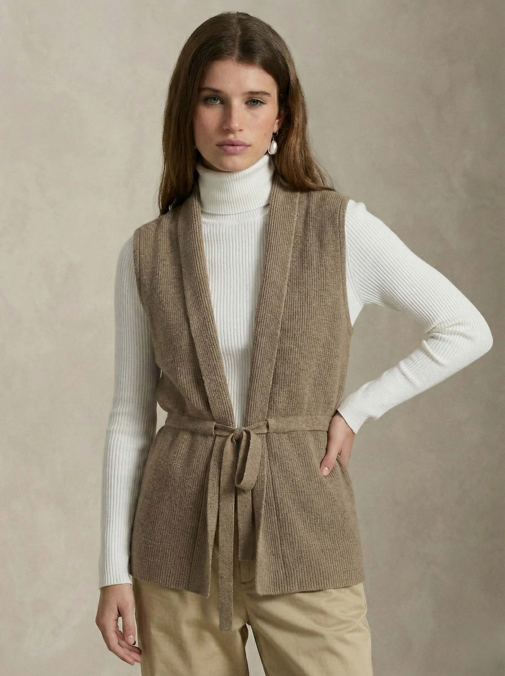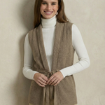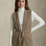 Characterized by its sleek architectural lines and soft, tactile depth, the Elowen Knit Vest offers a masterclass in effortless layering. The streamlined sleeveless profile is elevated by a wide shawl collar and a functional tie-waist, creating a rhythmic balance between structure and fluidity that grounds curated seasonal ensembles with a spirit of modern, understated grace.