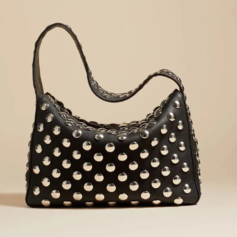 A captivating blend of rebellious edge and structural poise, the Nouveau Shoulder Bag elevates a classic silhouette with bold, geometric accents. This statement piece balances a refined pebbled texture with shimmering hardware, offering a sophisticated focal point for the modern, avant-garde wardrobe.